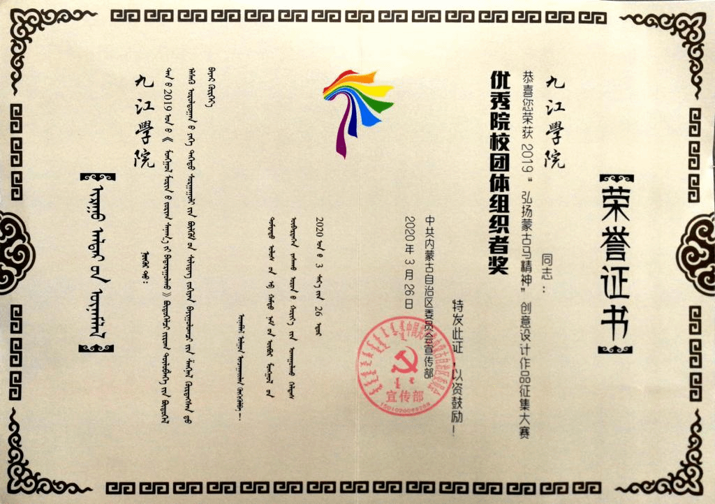 在内蒙古自治区委员会宣传部、文学与艺术界联合会主办的“蒙古马”设计大赛活动中,九江学院荣获优秀团体组织奖。