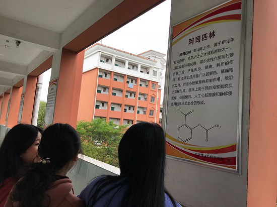 三楼走廊制作的是与药学有关的一些典型的药物化学分子式的相关图片,内容有青蒿素、肾上腺素、阿司匹林、冠状病毒、青霉素钠等药物分子。