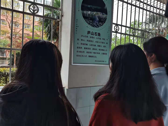 宿舍一楼走廊制作内容为有关动物学的图片,图片内容主要为华南虎、白鹳、长江江豚、庐山石鱼、独角仙等动物,使同学们在日常生活中更加了解各类动物的相关知识。