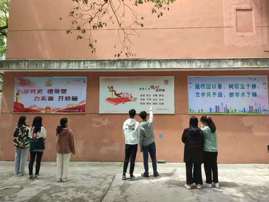 在学生宿舍女3栋,宿舍外墙上有关党史学习教育等的宣传画十分醒目,周末的早晨,仍有同学在文化标语处学习讨论。走进宿舍楼内,宿舍各楼层长廊上张贴了各种与专业有关的动物、植物及分子结构式的相关内容的宣传信息。