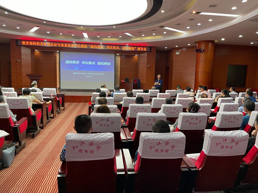 为适应新时代专业建设需求,促进专业建设内涵式发展,提高人才培养质量,有力推动师范类专业认证工作,6月9日教育部师范类专业认证专家委员会委员宋冬生教授应邀来我校,作了题为《面向需求,突出重点,建实两线》的报告。副校长纪岗昌主持会议并讲话,各相关单位负责人、各专业负责人等100多人参加了报告会。