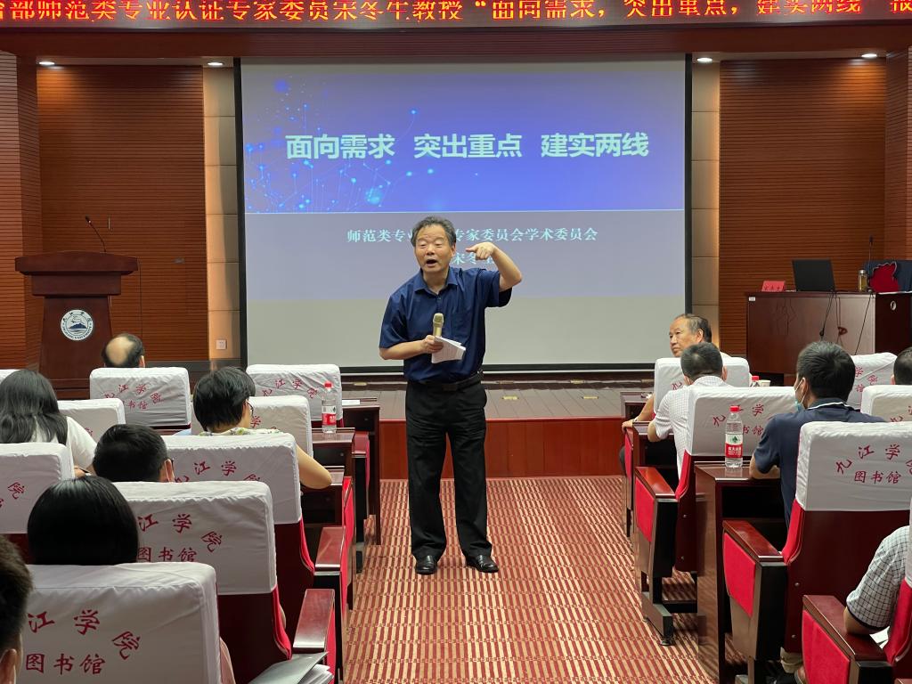 纪岗昌在主持报告会时指出,师范类专业认证是学校落实国家专业标准,重塑人才培养体系,培养合格未来教师的一项重要工作,是考核学校专业建设和人才培养水平的硬指标。师范类专业是我校的传统优势专业,参与师范类专业认证对检验学校师范生培养质量,促进教师教育改革具有重要意义和作用。他要求与会人员认真学习、深刻领会,要有高度的使命感和责任感,以师范类专业认证工作为契机,以认促改,全面提高我校师范类专业人才培养质量。