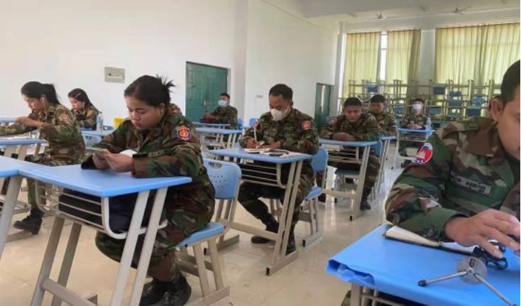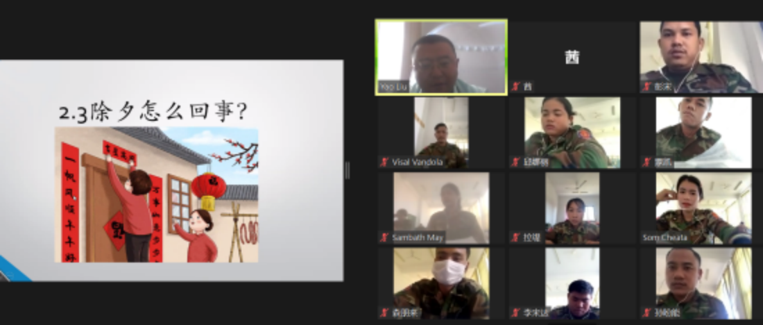 1月20日,柬埔寨皇家科学院孔子学院-王家军陆军学院汉语中心举办了“虎虎生威,你最棒!”线上线下春节文化讲座。陆军学院中文班全体学员身着整齐的迷彩服,参与了此次活动。