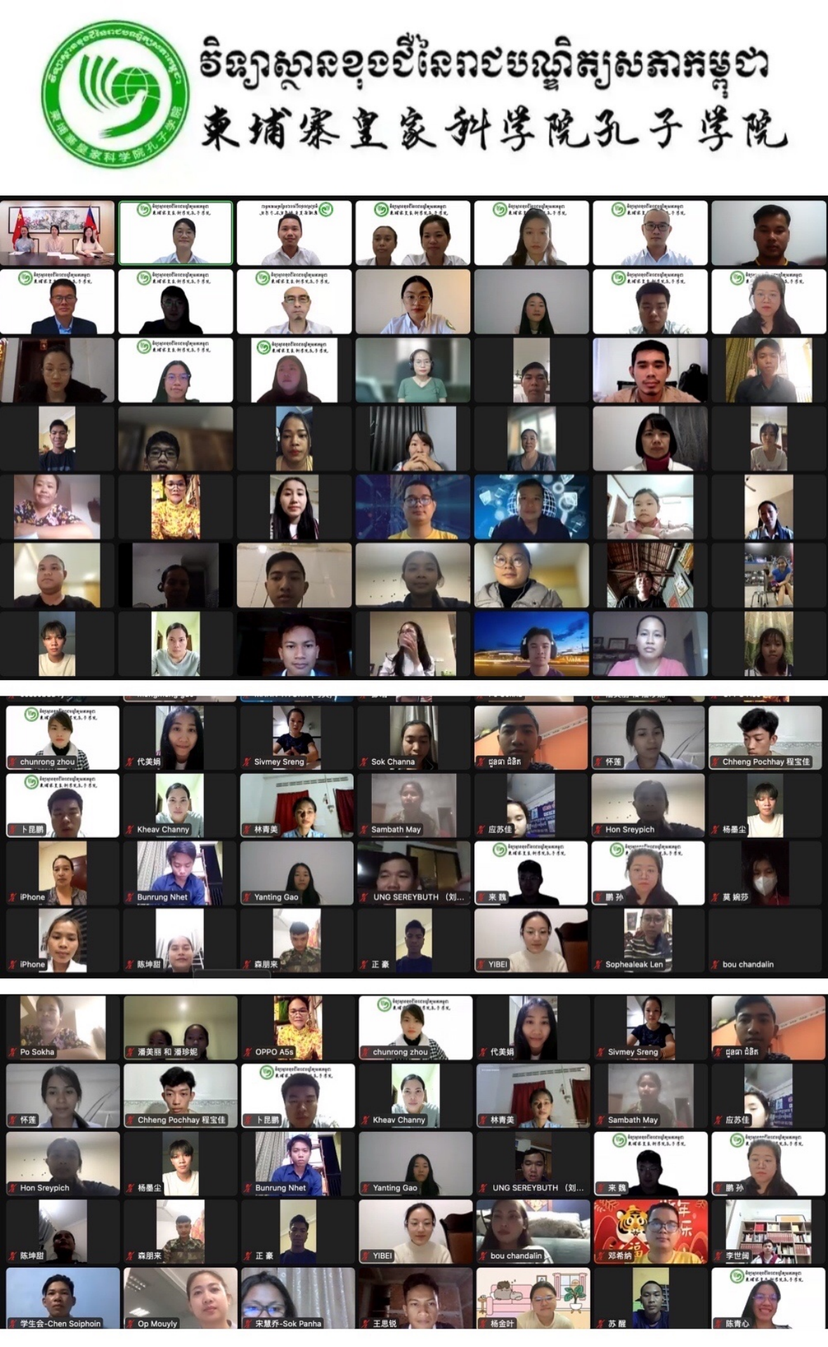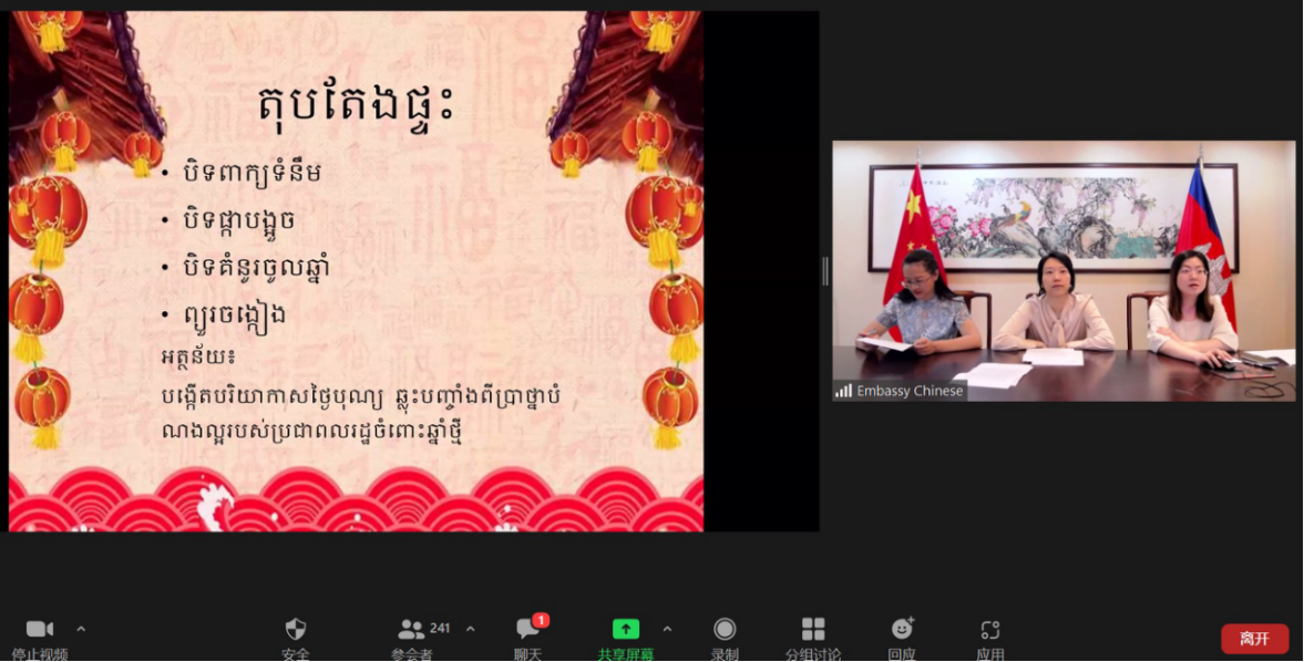 1月20日,柬埔寨皇家科学院孔子学院邀请中国驻柬埔寨大使馆申悦、赵文笑和翁银珊等3名外交官在线上进行了主题为“交流促相知,喜迎虎年春”的春节文化讲座。