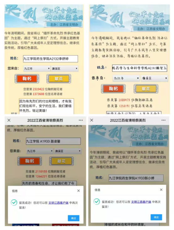 在学院发布倡议书后,药学学院学子积极参与中华英烈网“2022奋进·网上祭英烈”网上祭扫活动,在网上敬献花篮、寄托哀思,以表达对英雄先烈的感恩和敬仰。来自药学与生命科学学院的大学生们用“云献词”的方式向烈士致敬,号召青年大学生们向烈士们学习顽强拼搏、艰苦奋斗的精神,坚定信念跟党走,传承红色基因。