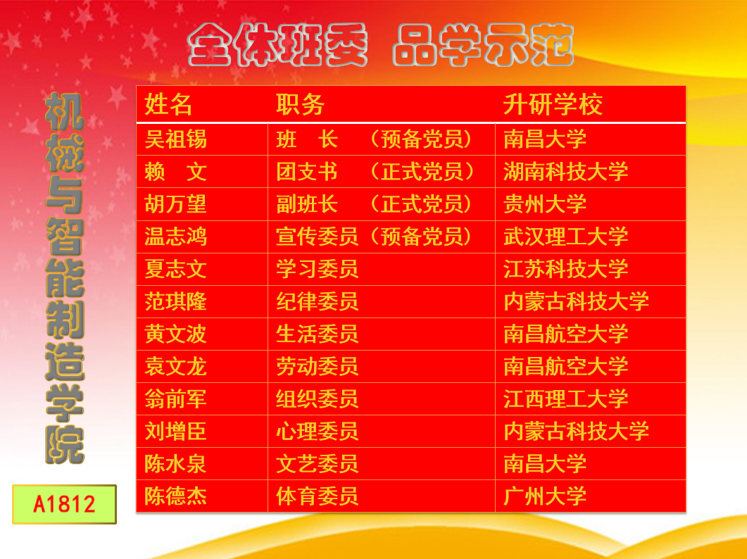 在大学生活后半段,有不少的同学不再愿意当班干部,怕浪费时间,影响学习。但机械学院A1812班的全体班委,用自己的行动给大家say no。随着今年考研复试结果的公布,让人惊喜的是,这个班级的所有班委都考上了研究生。班长吴祖锡考上了南昌大学研究生,副班长胡万望考上贵州大学研究生,团支书赖文考上湖南科技大学研究生,学习委员夏志文考上江苏科技大学研究生……