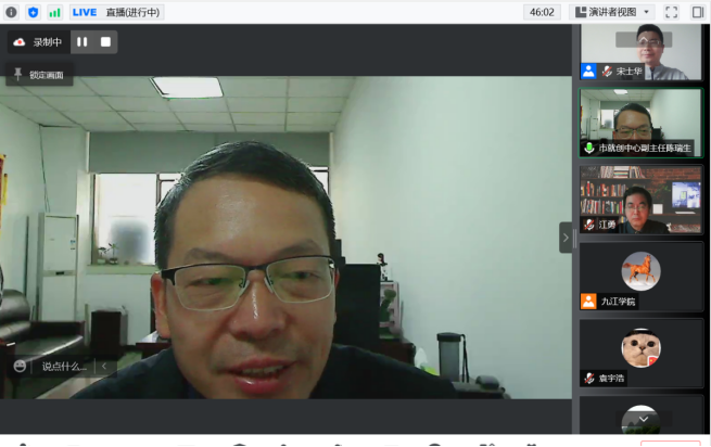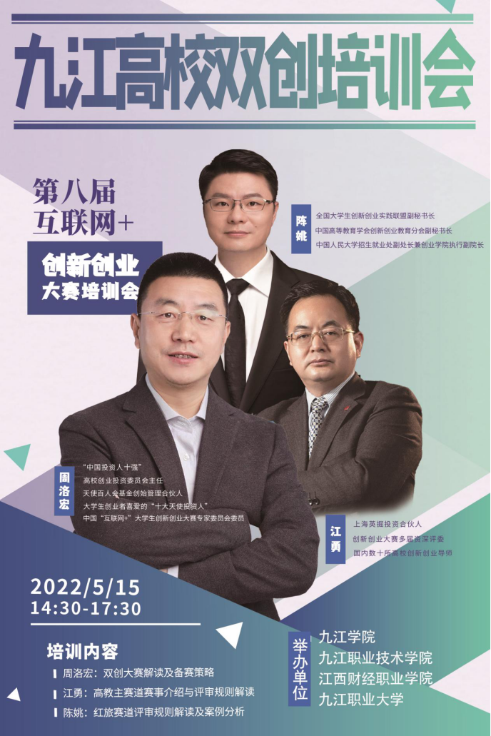 5月15日下午,九江高校第八届“互联网+”大学生创新创业大赛培训会在我校举行。会议特邀“中国投资人十强”、高校创业投资委员会主任、中国“互联网+”大赛评审委员会委员周洛宏,上海英掘投资合伙人、双创大赛资深专家江勇,中国人民大学创业学院执行院长、中国高等教育学会创新创业教育分会副秘书长陈姚到会指导。我校副校长陈春生、市就业创业服务中心副主任陈瑞生出席视频会议并致辞。我校、九江职业技术学院、江西财经职业学院、九江职业大学创新创业学院负责人及师生300多人参加视频会议。