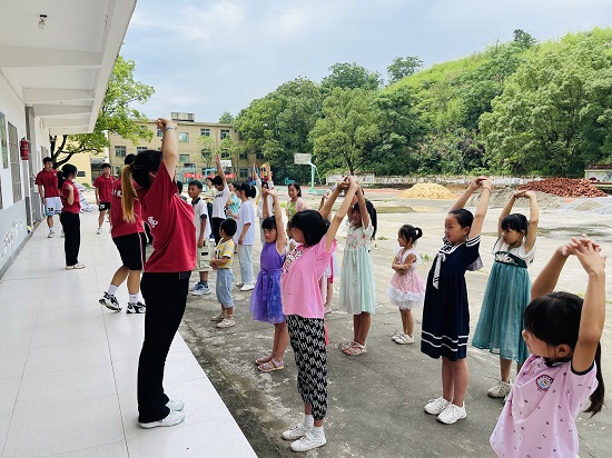 队员们结合体育专业特长,秉承以“体”育人的理念,开展了分组篮球、足球、排球、跳绳、健美操等技巧展示和体育教学志愿活动。