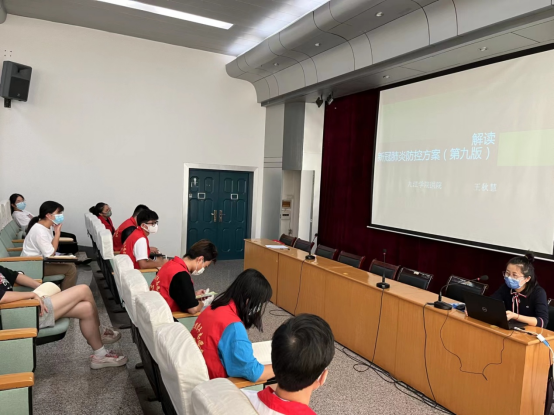 讲座的第二部分是由校医院预防科王秋慧解读《新型冠状病毒肺炎防控方案(第九版)》进行讲解。她围绕《新型冠状病毒肺炎防控方案(第九版)》调整的总体思路、总体要求、风险区域(人员)划定管控、措施优化调整依据、疫情监测与处置、组织保障等部分进行了重点讲解。王秋慧表示,目前疫情尚未结束,了解传染病相关知识,疫情防控不能掉以轻心,要克服麻痹大意的思想。在参与社区志愿服务和迎新现场的志愿服务时,要戴口罩、手消毒,做好个人防护,同时进行开展“三查一戴”,对涉疫地区和省外来(返)浔人员查验核酸检测阴性证明,平时的生活中,应该每日开展环境清洁卫生和通风消毒,进行自我健康监测和报告。校园作为人流量密集的地方,传染病易高发,同学们了解传染病相关知识,不仅是为自己负责,也是为他人负责。她还特别提醒,戴口罩是防止病毒传播的重要途径,一旦发现相关症状,一定要及时就医。