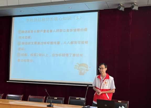 讲座的第一部分由校医院邀请的五里社区医院副院长、基层卫生宣传志愿者陶凯讲解结核病相关知识。陶凯用通俗易懂的语言,围绕结核病的分类、诊断、特征、预防和控制以及学校结核病日常管理及应急处置等方面作了详细讲解,并展示了部分肺结核患者的相关图片,使大家意识到肺结核不再是一种与己无关的疾病,它就真实地存在于我们周围,并能够更加直观地认识到感染肺结核后所出现的一系列症状。
