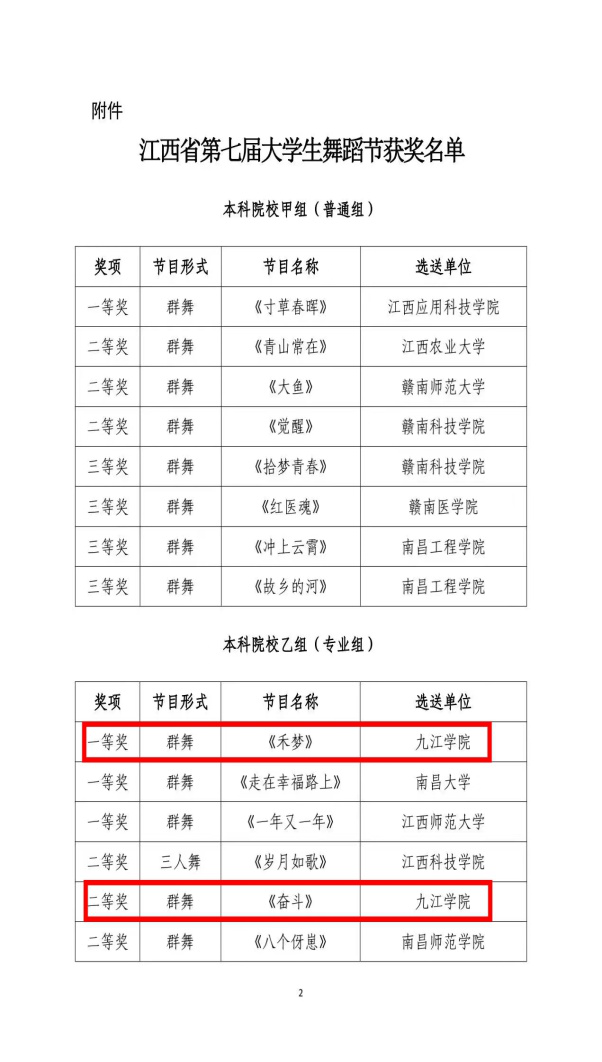 江西省教育厅、江西省文联举办的江西省第七届大学生舞蹈节终评工作于12月17日顺利结束。经评审委员会评选和组委会核定,根据入围作品得分排名,共评选出优秀作品奖59个(一等奖9个、二等奖 21个、三等奖29个)。九江学院选送的群舞《禾梦》荣获本科院校乙组(专业组)一等奖第一名,群舞《奋斗》荣获本科院校乙组(专业组)二等奖第二名。