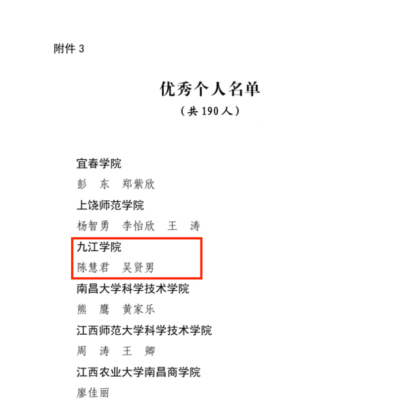 近日,中共江西省委宣传部、江西省文明办、江西省教育厅、共青团江西省委、江西省学生联合会下发了《关于2022年江西省大中专学生志愿者暑期“三下乡”社会实践活动的通报》,我校荣获2022年全省大中专学生志愿者暑期“三下乡”社会实践活动优秀单位,“三下乡”团队“九江学院临床医学院/附属医院赴都昌县医心暖乡爱心医疗服务队”荣获“优秀实践团队”称号,我校教师陈慧君,化学化工学院吴贤男同学荣获“优秀个人”称号。