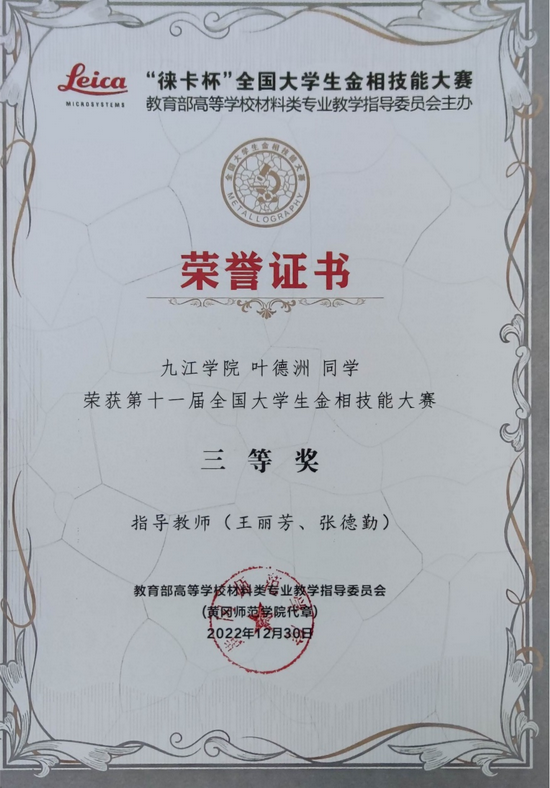 近日,由教育部高等学校材料类专业教学指导委员会主办、黄冈师范学院承办的第十一届全国大学生金相技能大赛落幕,共有来自清华大学、吉林大学、四川大学、武汉大学等414所高校的3700余名在校大学生参加了复赛和决赛阶段的比赛。我校材料科学与工程学院周涛同学荣获个人一等奖,余里泽同学荣获个人二等奖,叶德洲、黄事成同学荣获个人三等奖。