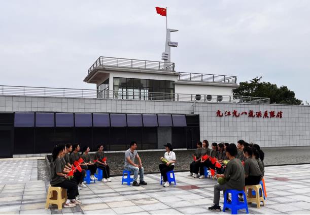 在九江九八抗洪展陈馆,运营负责人、校友曹雨晴带领同学们参观了六个展区,其中沉船堵口最为惊心动魄。在九江九八抗洪展陈馆这座煤船造型的建筑前,同学们齐心协力模拟开大船的情景,在守望相助中体验抗洪英雄力挽狂澜的壮举,致敬前辈舍生忘死的英雄气概。