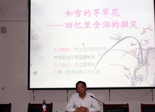 回首向来萧瑟处,已是离离茅草花。4月28日晚,由外国语学院三立国学社主办的第十二期新语堂讲座于香远楼三楼拉开了序幕,来自庐山文化研究中心的常务副主任吴国富教授担任主讲嘉宾,讲述他早年的人生经历和艰苦的求学生涯。学生科科长彭晓出席本次讲座,方江南老师致开幕词。