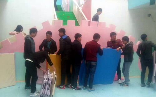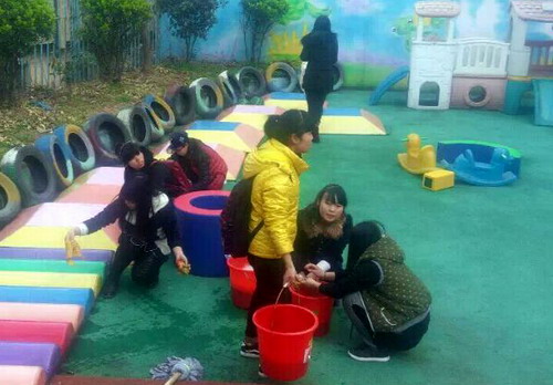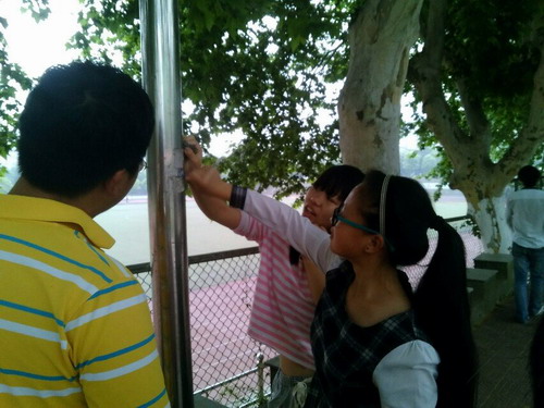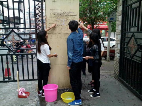 当日早晨七点,同学们在思贤楼前集合,各自带上抹布、钢丝球等清洁工具,在团支书的带领下,分成两组开始行动,一组从前门开始,另一组从后门开始。每个人都很努力的清理“牛皮癣”,再累再脏也不抱怨,尽力把校园变得更加美丽。中午,团支书组织每班15人在学校后门集合,每个人手上都带有打扫工具,来到中科院幼儿园,帮忙把拼版画图按原来构造,排列安装起来,以及对幼儿园里的环境卫生进行清扫。在劳动的同时,帮助孩子们形成良好的行为习惯,培养关爱他人,爱护环境的意识。
