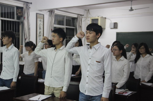 5月7日,药学与生命科学学院团委在心远楼会议室组织新团员入团宣誓活动,部分老团员与新团员一起重温入团誓词。