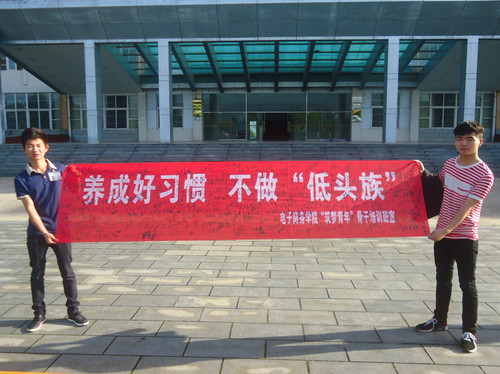 为切实加强学风建设,净化学习环境,摒弃课堂刷微薄、发微信、玩QQ的恶习,电子商务学院“筑梦青年”骨干培训班于5月12日向全院同学发起倡议——“养成好习惯,不做‘低头族’”。