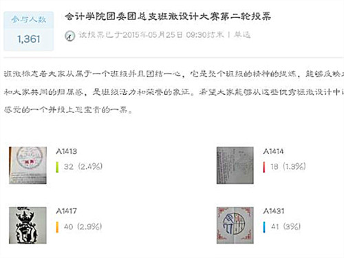 活动中,各班级先将设计手稿与电子稿交到团总支,再由团总支干事以投票的方式选取入围的八个设计作品并记录相应的班级。最后通过微博平台的线上方式进行投票。投票如期进行,各班级班徽设计也得到了广大同学的关注。比赛结果为第一名B1411班,733票;第二名为B1412班,324票;第三名为B1432班,124票;最佳创意奖为B1221班。
