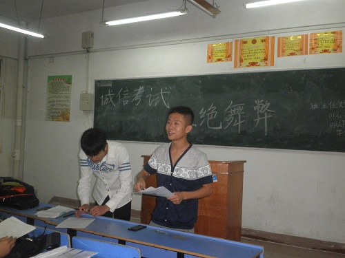 班会上,各班团支书向同学们宣讲了诚信守信是中华民族的传统美德及其作为一个人所必须具备的素质。随后是同学发言,热心分享了他们的学习方法和经验,指出了“多思考,多做题”对于复习备考以及以后学习的重要性。班会的最后,班长对这次的班会做出了总结并鼓励大家积极备考应考,在期末考试中取得一个好成绩。同学们郑重地在“诚信考试,杜绝舞弊”承诺书上签下了自己的名字。