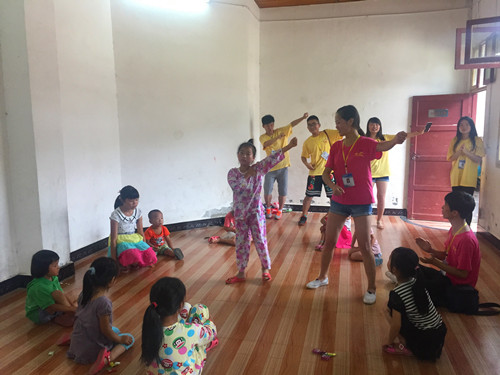 随后,服务队来到了双井村的高峯书院,并和留守儿童开展了亲密的交流活动,尤其是“推广普通话,推行规范字”的推普活动。起初参加活动的儿童显得十分拘谨,在服务队成员的热情介绍后,他们才慢慢融入到活动中。服务队成员通过一边游戏一边推普的方式引导留守儿童说好普通话,用好规范字。