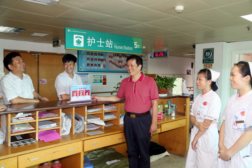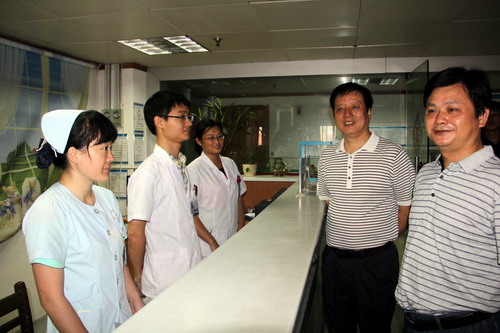 9月5日上午,张志平院长与值班副院长胡志坚等来到西院,对正在试运行的南门特色门诊楼进行查看,仔细询问护士长运行情况。随后,张院长一行到住院部、门诊楼各处视察,逐层检查各科室的值班人员在岗在位情况,并对患者就医体验和满意度随机进行调查和询问。患者对附属医院医德医风和医疗技术交口称赞,但也指出了附属医院住院楼中央空调保养不到位,制冷不佳问题,张院长当即叫来后勤部门负责人,提出具体要求,责成限期整改。