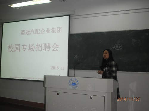 11月27日下午,机材学院于竞知楼512教室举行东莞市箭冠汽车配件有限公司专场招聘。东莞市箭冠汽车配件有限公司人力资源部经理陈玉,欧嘉琪女士及2016届相关专业应届毕业生参加了本次招聘会。