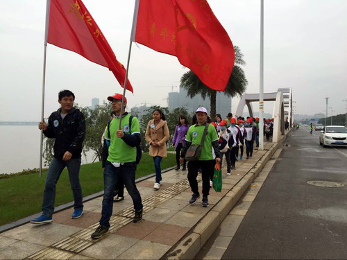 本次活动由九江市爱心之家协会主办,顺时针环八里湖徒步走,全长10.2公里,历时两个半小时。环湖沿途风景秀丽,志愿者们一边欣赏大自然的风光,一边不忘中步向前走。行程到一半时,大家已疲倦不已,为调动大家的积极性,带队者起歌高唱,一路上歌声飘扬,大家不禁跟着歌声加快了前进的步伐。护理学院志愿者队作为九江四大高校的第一支队伍,穿着统一校服,一路昂首踏步,形成一道亮丽的城市风景线,最终成功走完全程。
