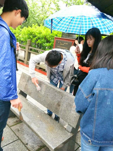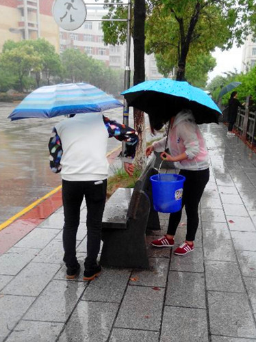 天空一直下着细雨,但是电子商务学院社会实践部全体成员在吕素萍部长的带领下冒着雨对学校的渊明大道,山谷大道“牛皮癣”进行了清理。活动过程中,雨淋湿了同学们的衣服,但是浇灭不了同学们的热情,清洁过程中,成员们发挥不怕苦、不怕累的精神,精神饱满、干劲十足,手撕不掉,就用水泡,清洁球擦,指甲刮,直到彻底还原本来面目。经过一个多小时的努力,同学们用辛勤劳动换来了学校的清洁,也换来了过往同学的赞誉不绝。