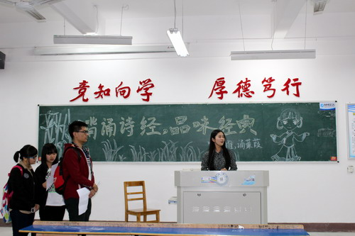 各班所选篇目有气势磅礴的《蜀道难》,恢宏壮观的《梦游天姥吟留别》,哀婉凄凉的《氓》,清新浪漫的《蒹葭》、《关雎》,雄奇瑰丽的《春江花月夜》,发人深省的《劝学》等国学经典。各班背诵者流利通顺,感情真挚。