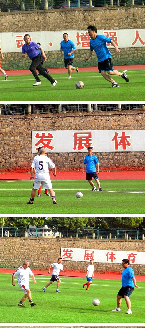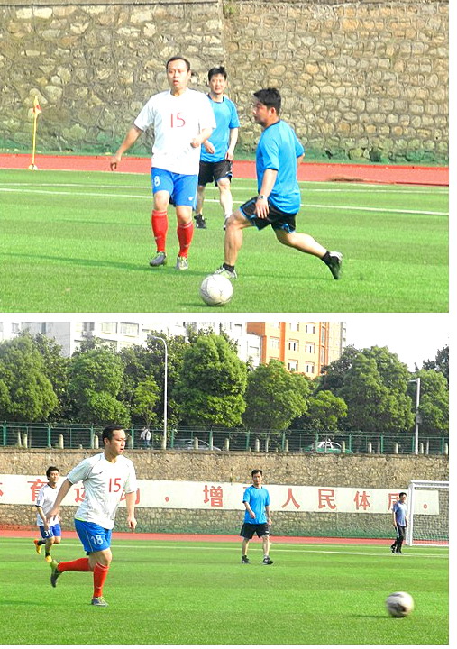 本场比赛是两个校区之间交流的第三场比赛。主队浔东校区代表队由杨晓宁主任亲自督战,客队八里湖校区代表队则有管理办主任段宝斌和体育学院党委书记张浦强上场领衔。比赛分为上下半场各30分钟。下午4点比赛正式开始,场上队员们你争我夺,只见足球在各队员间舞蹈、不时又在空中旋转,精彩的场面和完美的进球在这种轻松的比赛氛围中频频诞生。得到现场观赛同学的阵阵喝彩声。