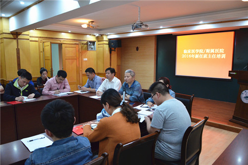 5月20日下午,临床医学院召开了2016年新任班主任培训会,临床医学院党委张南华书记、贾宗林副院长出席会议并讲话,学生科、团委及全体辅导员、新任班主任20余人参加。会议由学生科朱丽君科长主持。