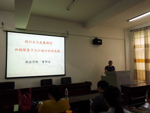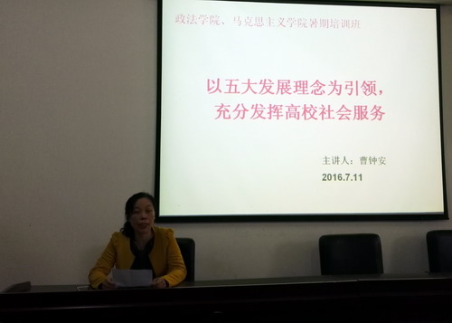 7月11日上午,政法学院副院长曹钟安在培训班上作了题为《践行五大发展理念,努力服务地方社会》的专题报告,报告由马克思主义学院院长汪力平主持。曹副院长结合五大发展理念精神要领,分析了地方高校如何在服务地方社会中践行五大发展理念,并以政法学院近三年来服务于九江地方社会的实例讲解了地方高校践行五大发展理念的具体路径与基本思路。汪院长在点评中指出:曹钟安副院长以实际工作为例,以新的视角来解读高校如何践行五大发展理念,讲身边人,谈身边事,听起来很亲切,别有一番风味。