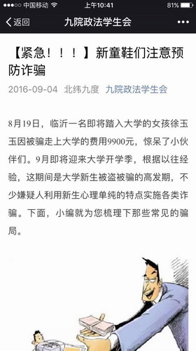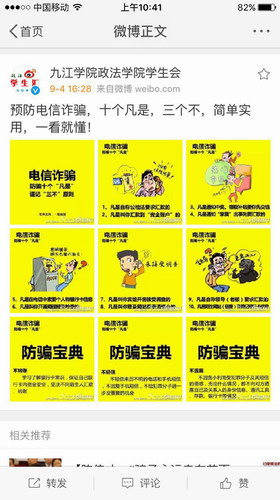 近期以来,高校新生报到期间发生很多起电信诈骗案件,为切实提高新生对电信诈骗犯罪的识别和防范能力,维护校园稳定,政法学院利用微博、微信等新媒体,认真组织开展“防范电信诈骗”宣传。