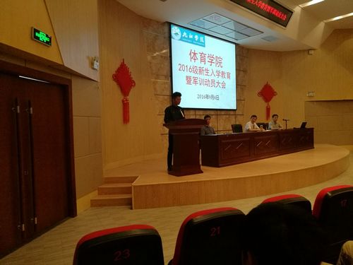 9月8日上午,在环境优美的九江八里湖畔,体育学院隆重举行2016级新生开学典礼——暨新生入学教育、军训动员大会。体育学院行政党政领导、各科室负责人、班主任、教师代表及全体新生参会,会议由学生学科长梅红平同志主持。