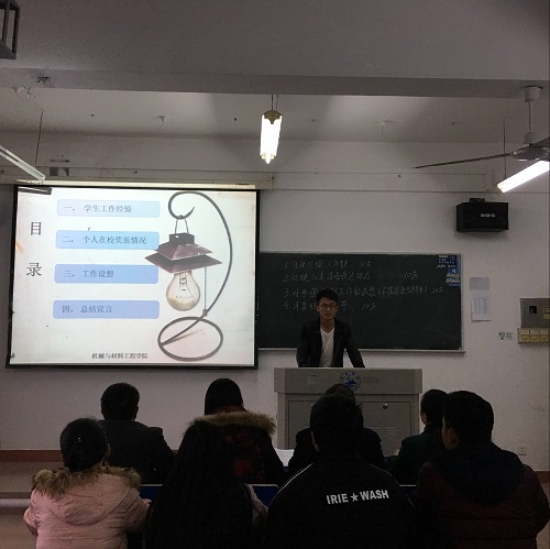 11月9日下午,机材学院于竞知楼309教室举行团学联学生干部竞聘大会。机材学院党委副书记陈娜、团委书记彭西峰、学生科副科长李新萍、团委副书记欧阳效卓、学生科老师李悦以及团学联部分学生干部担任了本次竞聘大会的评委。机材学院竞聘团学联学生干部的64名同学参加了本次大会。