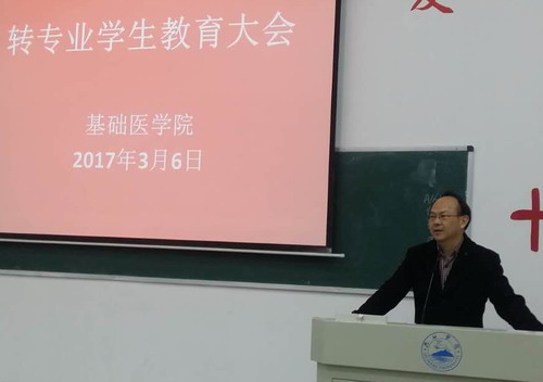 近日,基础医学院在华文楼阶二教室召开了2016级转专业学生教育大会,基础医学院院长车向新、党委书记余朝阳、副院长郑美蓉、副院长汪鑫教授、教学科研管理科、学生科、团委、转专业班级班主任、辅导员参加了会议,会议由教学科研管理科副科长牛力主持。