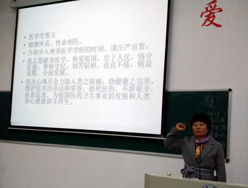 教学科研管理科的林玲老师给同学们介绍了学籍卡的填写,免修、补修课程的办理手续和相关注意事项,学生科和团委的老师也给同学们介绍了各职能科室和日常工作内容,最后由学生科何翠媛科长带领大家宣读了医学生誓言。