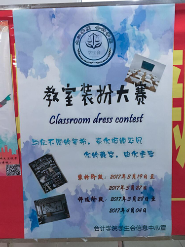 为丰富校园文化活动,创造美好生活空间,进一步美化学生的学习环境。3月16日晚,会计学院班级管理委员会成员为即将举办的首届教室装扮大赛进行下班宣传。