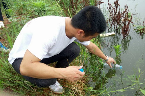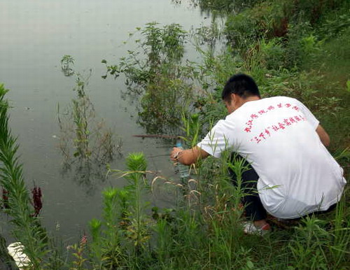 服务队队员们到达目的地之后进行实地考察,选取合适的采样地点,通过对鄱阳湖流域九江都昌段的水质调查,了解流域水环境的概况,流域周围经济发展对水环境问题的影响。让九江学院的大学生对鄱阳湖现状有一个初步的感性认识。近期常遇下雨天气,鄱阳湖被外来垃圾污染较为严重。
