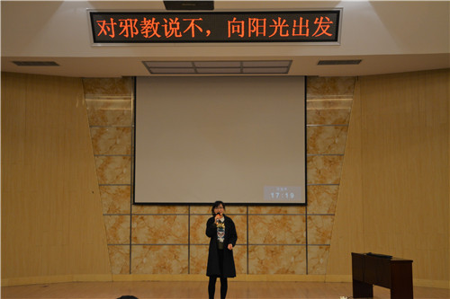 为提高在校大学生甄别和抵御邪教的能力,11月21日晚,政法学院社会实践部和权益部联合于综合楼四楼报告厅开展主题为“向邪教说不,向阳光进发”的反邪教宣传活动。团委刘梦老师与全体17级新生一同参加此次活动。