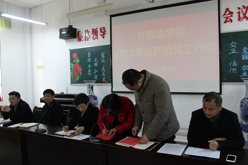 3月21日下午,外国语学院在香远楼315室召开从严治党工作会议,学院领导,副科以上,教研室正副主任,党支部书记参加,会议由院长韩琨主持。