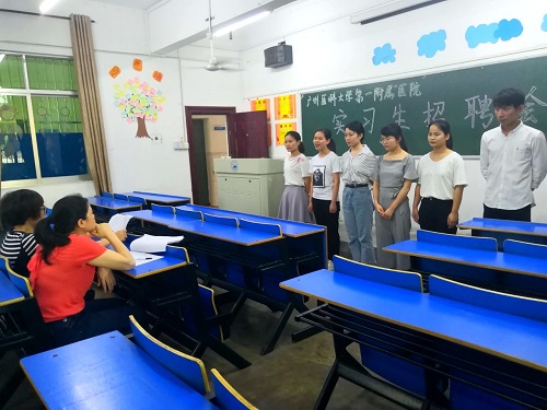 5月17日下午,护理学院学生科科长范玲玲和辅导员袁青兰老师在思贤楼205对本届报名参加广州医科大学附属第一医院实习的同学进行面试选拔。