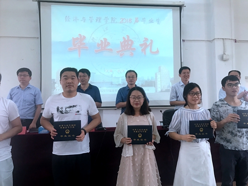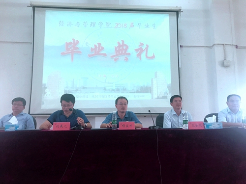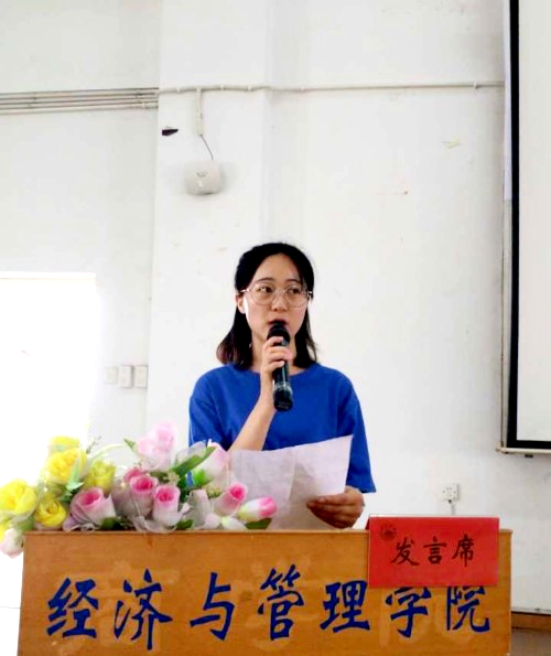 毕业生代表和教师代表发言。毕业生代表肖玲玲向母校、向经管学院、向陪伴他们走过大学生活的老师、班主任、辅导员、同窗表达了由衷的感谢以及对大学生活的依依不舍之情。