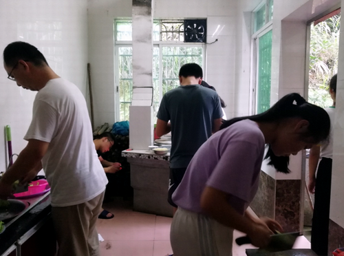 下午,理学院和外国语暑假“三下乡”服务队再次通力合作,成员们都积极主动的做饭、洗碗、扫地等。经过两天的相处,两队逐渐形成了一种默契,互相产生了信任,相信这一定是两队友谊的开始。
