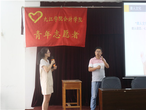 魅力手语,与爱同行。为了传播爱与心声,9月16日上午,会计学院团委青年志愿者服务部于文理楼117开展了“第一期会计学院手语班开班及第一课堂”。九江博爱聋校的段胜兰、梅军、冯刚三位老师,九江聋人协会的饶渊、曲习男两位老师出席了本次活动,会计学院团委青年志愿者们积极参与。