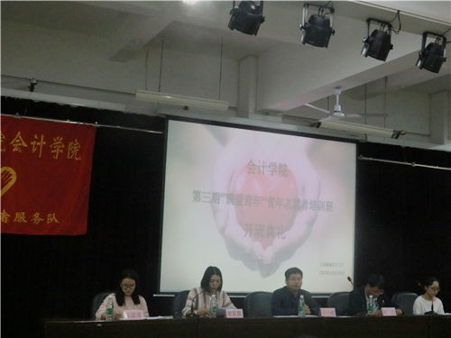 10月26日晚,会计学院团委青年志愿者服务部于文理楼117举办了会计学院第三期“筑爱青年”志愿者培训开班典礼。会计学院团委副书记王一成、团委青年志愿者服部指导老师胡浩出席了本次典礼,会计学院团委青年志愿者服务部学生干部及全体青年志愿者参加了此次典礼。本次开班典礼由欧阳琪主持。