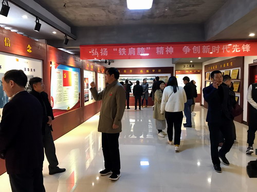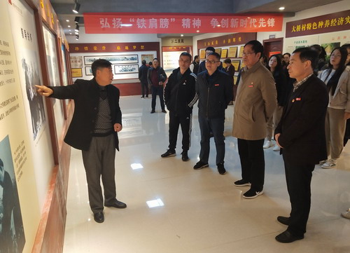 进入大桥村“铁肩膀”展览馆首先映入眼帘的是以鲜红壮丽飘扬的党旗为背景的“党旗引领建设美好大桥村”的标语。随后,大家跟随大桥村党支部书记参观了“峥嵘岁月历史丰碑”、“历史圣地 灵秀大桥”、“培养青年 接力争先”、铁膀精神 绽放荣光“、”四个第一 开创先河”、“发扬成绩再创辉煌”等版块,使大家深入了解了大桥村弘扬“铁肩膀”精神,争创时代先锋的理想信念,一张张复刻历史的老照片,一张张记录光辉的老报纸无不生动地再现了老一辈共产主义者的英雄业绩,让前来瞻仰的所有人对革命先辈肃然起敬。