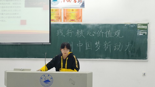 活动开始,各班团支书通过PPT以及演讲的形式向同学们介绍“社会主义核心价值观”和“中国梦”的含义。同时还分享了“感动中国”热点人物的故事,加深同学对“核心价值观”的认识。此外还强调了“践行核心价值观”的重要性,即将核心价值观落到实处,为中国的发展贡献出一份力量。