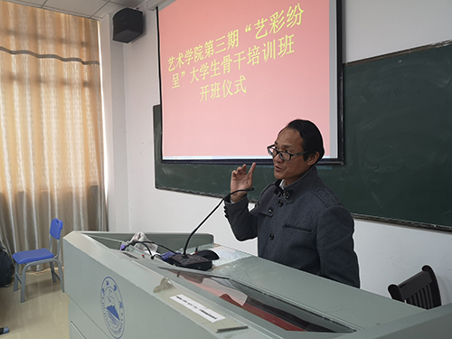 为进一步提高学生干部的思想政治素质及创新实践能力,4月12日中午,艺术学院于艺术大楼西102举行了第三期“艺彩纷呈”大学生骨干培训开班仪式。艺术学院党委副书记沈杨、团委书记刘元明、骨干班班主任以及本次所有骨干成员参加了此次仪式。